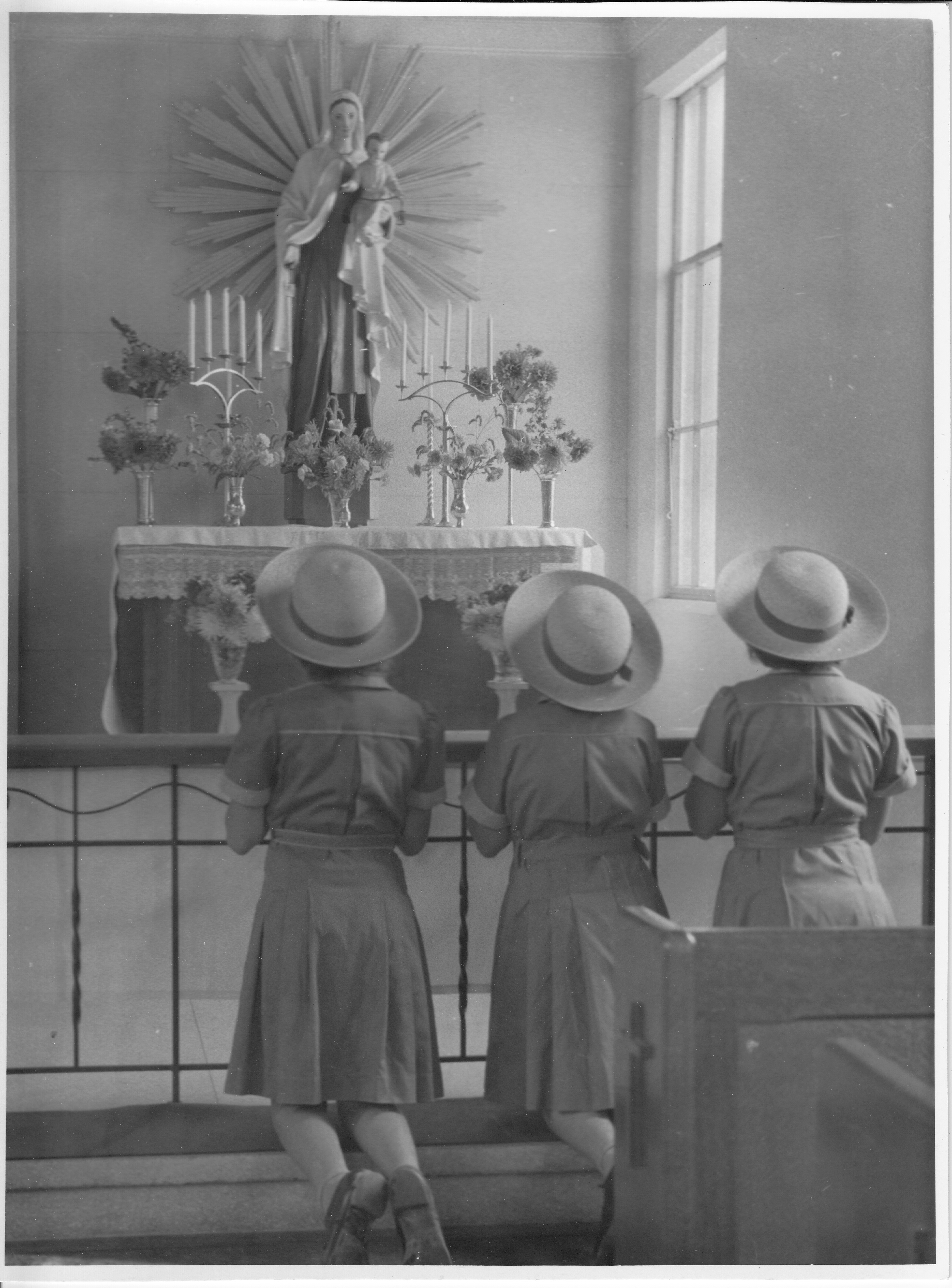 Our church, like many churches built before the middle of last century, had side altars located either side of the present sanctuary. These often also served the function of being devotional shrines, with Wenty’s being no exception. Our original Marian shrine, therefore, was at the front of the church, but on the opposite side of the sanctuary. Various alterations to the church saw the Marian shrine take several other forms and locations. Eventually, the desire to provide an appropriate space, while accommodating other liturgical needs, saw the shrine return to the front of the church in our recent renovations.
